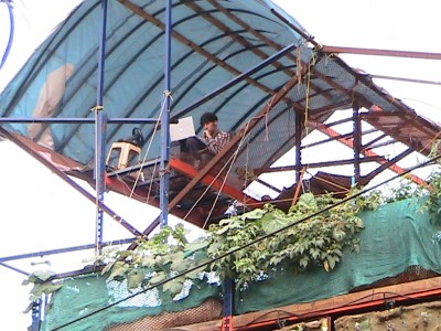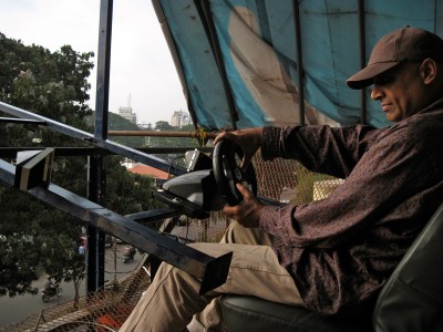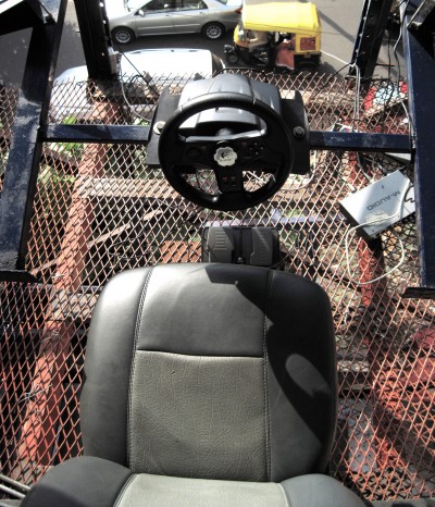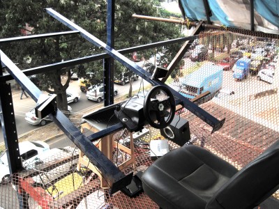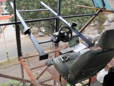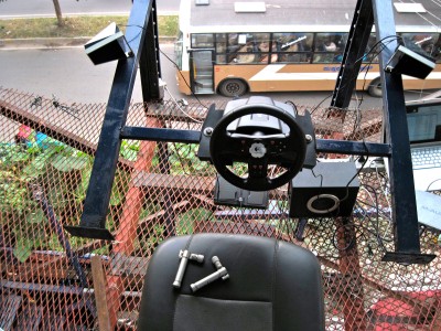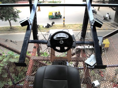 A car cockpit built onto the rooftop of the Jaaga building in Bangalore (India). The idea is to play the soundscape of a city which is dominated by the noise and sounds of traffic. Operating a steering wheel and pedals which are designed for computer games, the player will change the sound captured live on the street. Itβs never quiet in Bangalore, and everything which the microphones pick up becomes amplified once the virtual acceleration pedal is pressed down. The wheel transforms the sound with a set of resonant delays and harmonic distortion. "Overdrive" was set up and running throughout the year in 2011 at the Jaaga Centre in Bangalore in South India. Setup: Logitech Racecar Game Controller Stereo Speakers with Subwoofer 2 AKG Condenser Mics, waterproofed, installed at street level with 20m XLR cables. M-Audio Audio Interface MacBook Software: junXion, Ableton