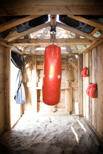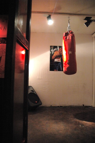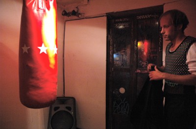 A punching bag is set up in a space. A loud drone playes from two loudspeakers from above the bag. Two boxing gloves are hanging next to it, they are offered to the audience as an invitation to punch the bag. The harder someone hits the bag, the quieter gets the loud drone in the room, and as soon as people stop beating, the sound in the room gets loud and complex again. Featuring a set of voice samples by Jacques Palminger which can be triggered with certain strikes, humorously affronting German boxer-idol Henry Maske. This installation has been premiered at the Dockville Festival in Hamburg in 2009 and has also been shown at the Golden Pudel Club in 2010. It has been realized in collaboration with Andi Stolze.