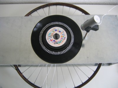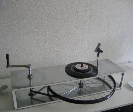 A mechanical hurdygurdy with a digital heart; the machine translates drawings on a blank CD body by the user into sound through a camera input. Every user can play their own drawings by placing the CD onto the hurdygurdy and moving the crank. The mechanics have almost entirely been built from old bicycle parts. The played sound can be burnt onto the CD afterwards. This installation is a collaboration with Corine Wiesenbach, Jan Claussen and Florian Grote. It was premiered at the Hyperkult14 Festival at Leuphana University Lueneburg in 2014.